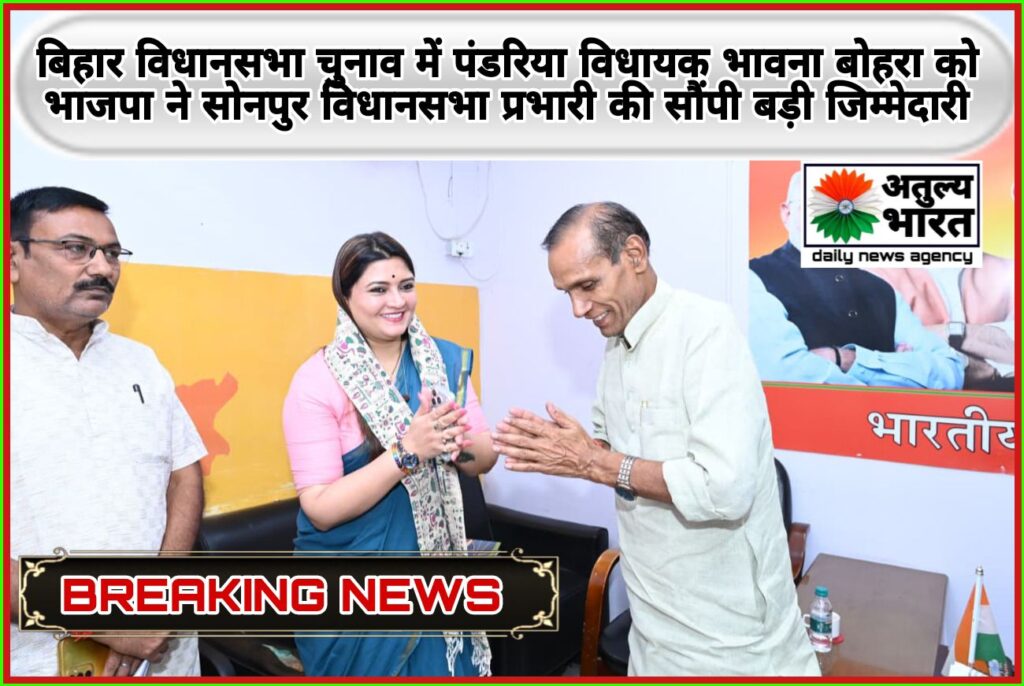 पंडरिया / बिहार ( अतुल्य भारत डेली न्यूज़ एजेंसी ) : पंडरिया विधानसभा विधायक भावना बोहरा की सक्रियता को देखते हुए भारतीय जनता पार्टी ने उन्हें बड़ी जिम्मेदारी दी है। आगामी 6 और 11 नवम्बर को होने वाले बिहार विधानसभा चुनाव में भावना बोहरा को जिला एवं लोकसभा क्षेत्र सारण अंतर्गत सोनपुर विधानसभा क्रमांक 122 के विधानसभा प्रवासी प्रभारी की जिम्मेदारी दी गई है और वे बिहार के लिए प्रस्थान कर चुकी हैं जहां रविवार को भावना बोहरा पटना प्रदेश भाजपा कार्यालय एवं सारण जिला भाजपा कार्यालय में आयोजित बैठक में शामिल हुईं और चुनावी चर्चा में सहभागिता की। इस जिम्मेदारी के लिए विधायक भावना बोहरा ने पार्टी नेतृत्व के प्रति आभार व्यक्त किया है। विदित हो कि 2024 में झारखण्ड में हुए विधानसभा एवं लोकसभा चुनाव में भी भावना बोहरा को प्रवासी प्रभारी की जिम्मेदारी सौंपी गई थी, जिसे उन्होंने बखूबी निभाया, लगातार क्षेत्र में दौरा कर जनता से मिली, भाजपा की नीतियों और प्रधानमन्त्री नरेंद्र मोदी के कार्यों, जनहित की योजनाओं एवं भाजपा के विकासवाद का प्रचार-प्रसार किया गया।